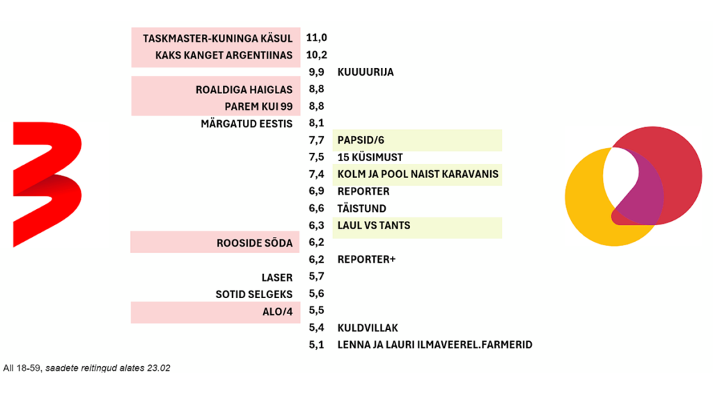 Kevadhooaja televaatajate tähelepanu on seni kõige tugevamini köitnud TV3 värsked saated. Esile on tõusnud mängulised formaadid "Taskmaster - kuninga käsul" ja "Parem kui 99", samuti Margna ja Jõekalda reisisaade Argentiinas. Ka saade "Rooside sõda" on saanud hoogsamaks ja